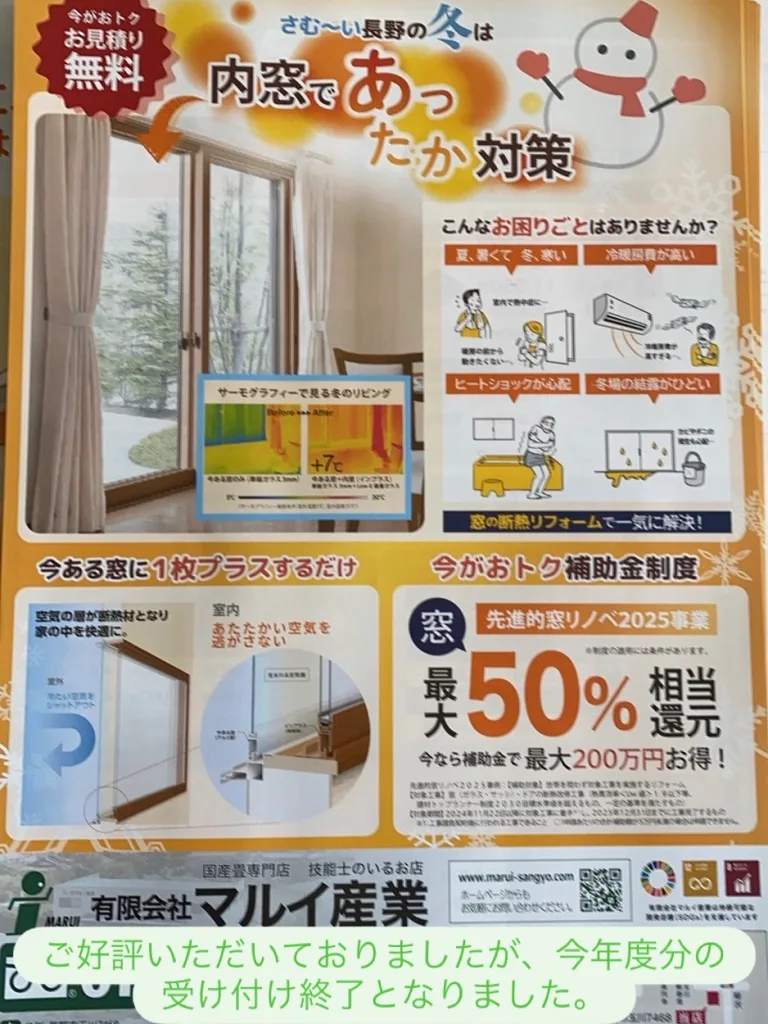 HOME > キャンペーン > 内窓であったか対策 ~2025~ 新着情報 内窓であったか対策 ~2025~ New!!(2025年12月04日) 内窓であったか対策2025 内窓の二重サッシ、ご好評いただいておりましたが、今年度分の受付終了となりました。次年度の補助金は、来年度に発信させていただきます。