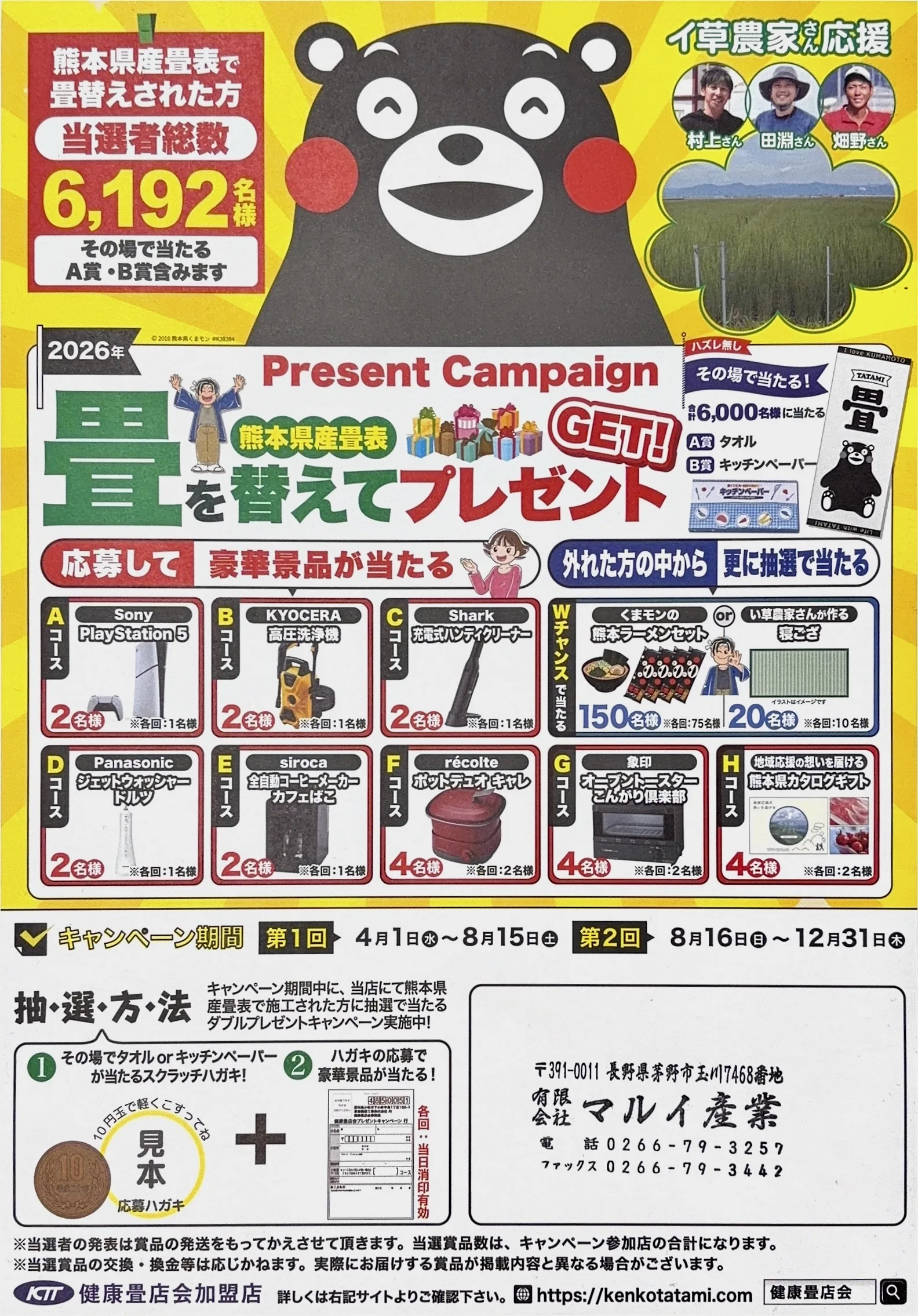 HOME > キャンペーン > 畳替えでプレゼントキャンペーン 新着情報 畳替えでプレゼントキャンペーン New!!(2026年04月08日) 安心の国産畳表で畳替えされた方に今なら応募で豪華賞品が当たるキャンペーンを実施中です! この機会にお気軽にご相談ください!