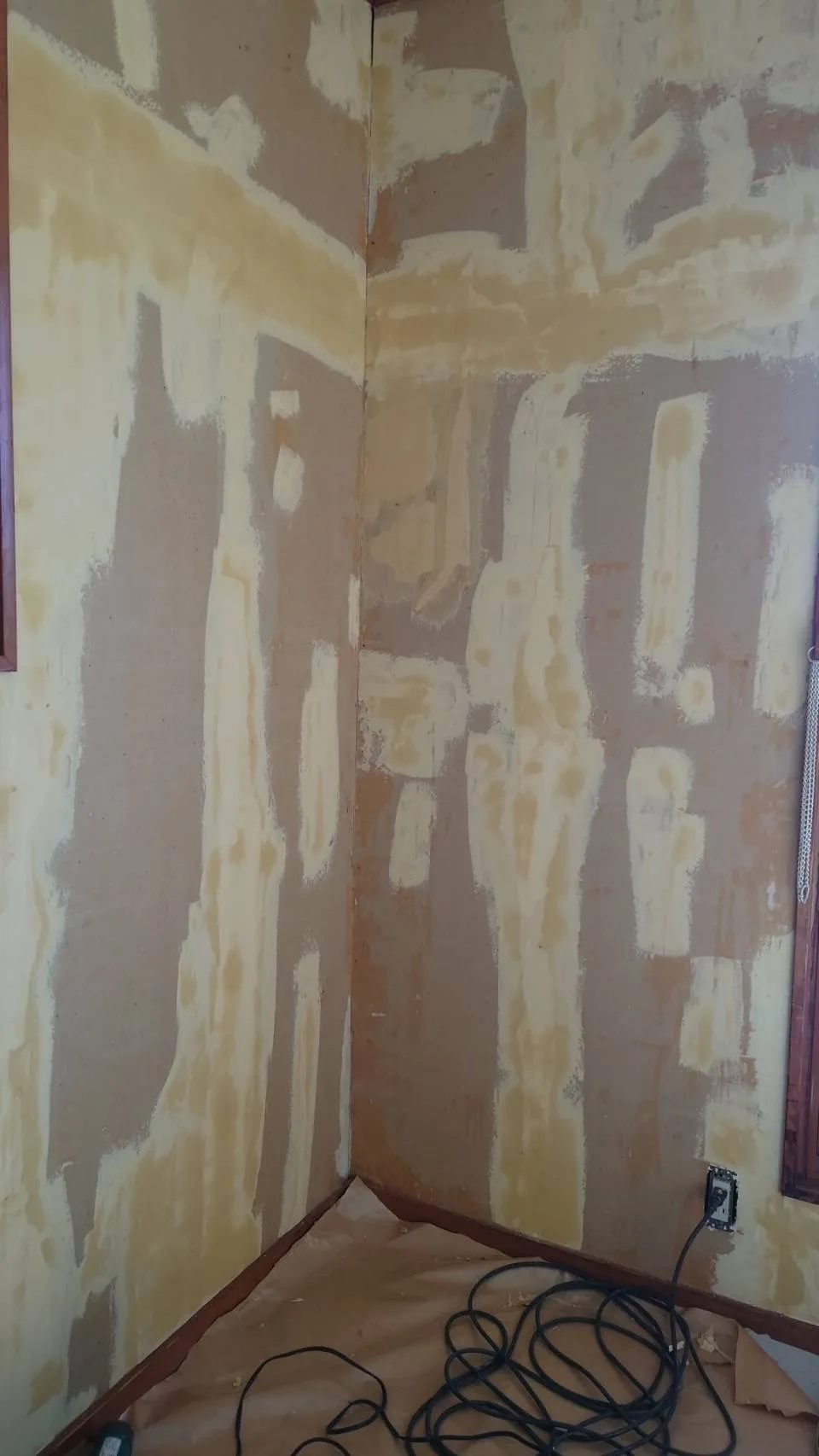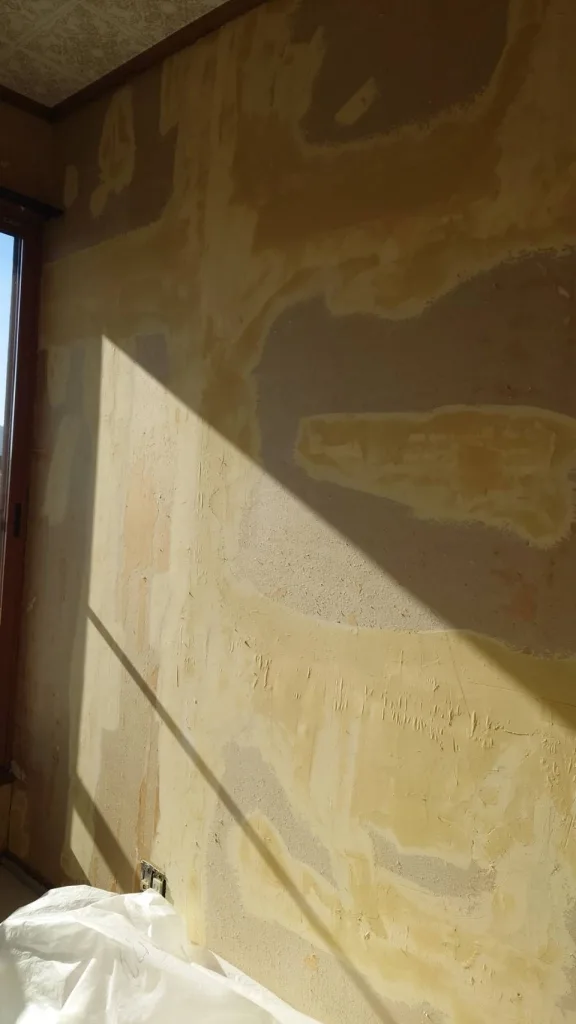 長年経っていたクロスですので、古いものを剥がしたら、一緒に下地も取れてしまい、凹凸ができてしまいましたが、下地をパテ処理を行い、できる限り平にし、